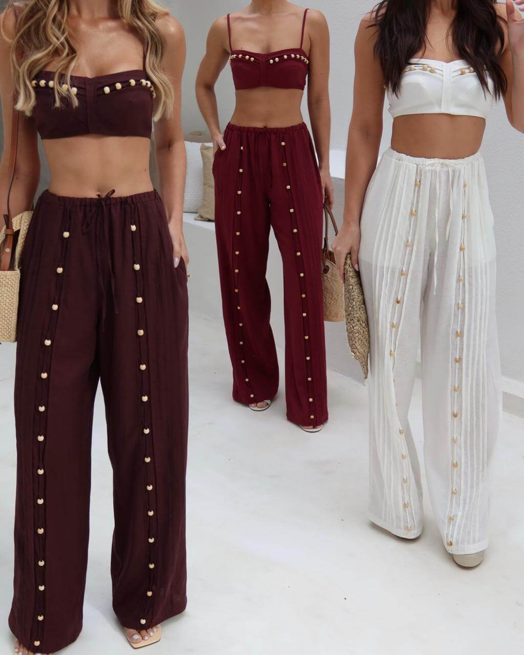 O Conjunto Lyra traduz frescor, estilo e sofisticação em uma peça única. Composto por top estruturado de alças finas e calça pantalona de caimento leve, ele é realçado por delicados detalhes em botões, que acompanham o conjunto e trazem charme artesanal à produção.